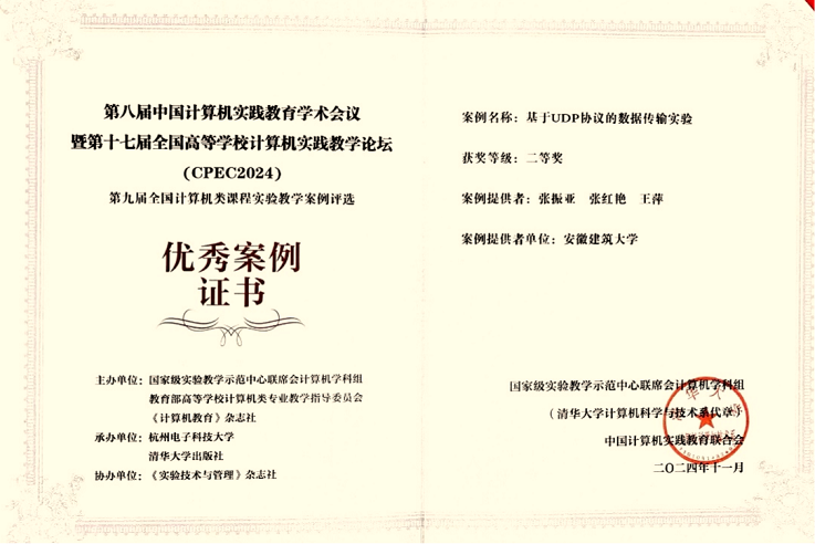 我校电信学院教学实验中心受聘为中国计算机实践教育联合会会员单位。在“第九届全国计算机类课程实验教学案例评选”中,电信学院张振亚、张红艳、王萍联合完成的教学研究案例从激烈的评选竞争中脱颖而出,荣获会议优秀案例二等奖2项。