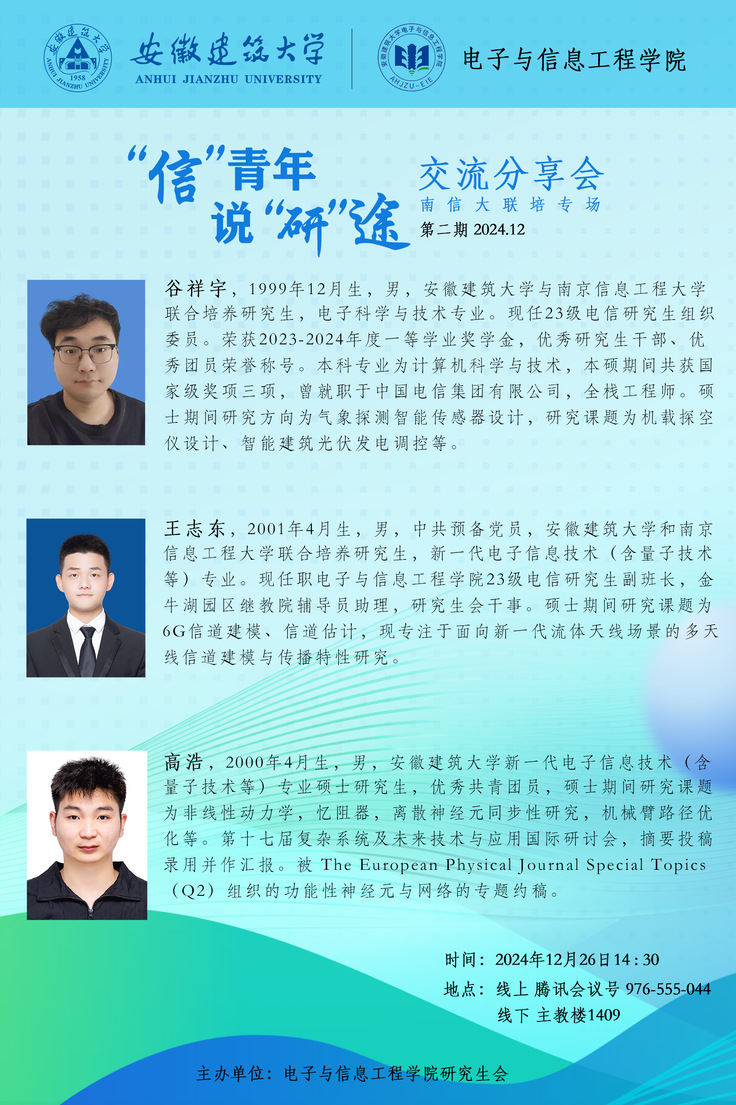 第二期研究生经验分享交流会已经圆满结束,但它为每位参与者带来的收获将持续在大家心中发酵,成为激励他们在未来学术探索与人生道路上不断追求进步和突破的动力源泉。电信学院将继续秉承“进德、弘毅、博学、善建”的校训精神,持续深化学校与南京信息工程大学合作交流,不断为研究生的成长和全面发展提供更加丰富的资源与平台,增强学校的学术氛围和文化,助力每一位学子在实现自己梦想的道路上,散发出独特的光彩与力量。作者:荚文静、孙晓庄;一审:孙晓庄;二审:丁媛媛;三审:孙长城