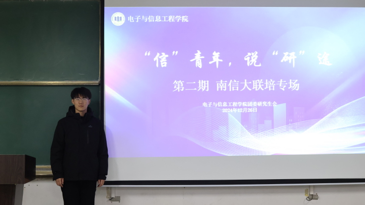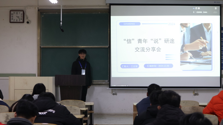 本网讯 12月26日下午,电子与信息工程学院团委在主教楼智慧教室1409举办了第二期“信”青年说:“研途”|榜样引领优秀研究生代表经验分享交流会,本次活动由学院研究生会办,邀请了学校与南京信息工程大学联合培养的3位优秀研究生代表参与分享交流,通过线上线下相结合的方式,让在校本科生、研究生与优秀研究生学长交流,分享考研学习经验、研究生阶段学术研究与学术心得、学期阶段规划,研究生生活及未来职业规划得等方面的宝贵经验。活动由学院研究生团委负责人刘国庆主持,共100余名研究生、本科生参加此次活动。