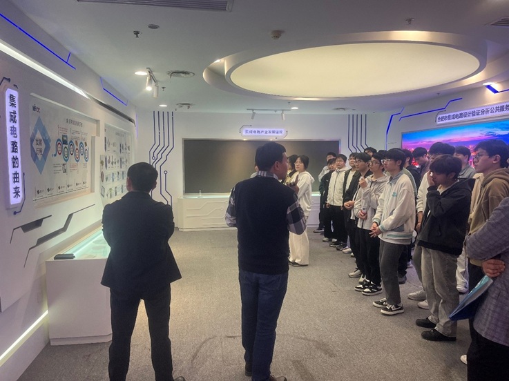在平台展厅的沉浸式研学环节,同学们通过展板和工程师的讲解了解了集成电路领域的发展历史和相关知识,并参观了芯片测试验证工程技术中心,将课堂理论知识与产业实践场景深度对接。