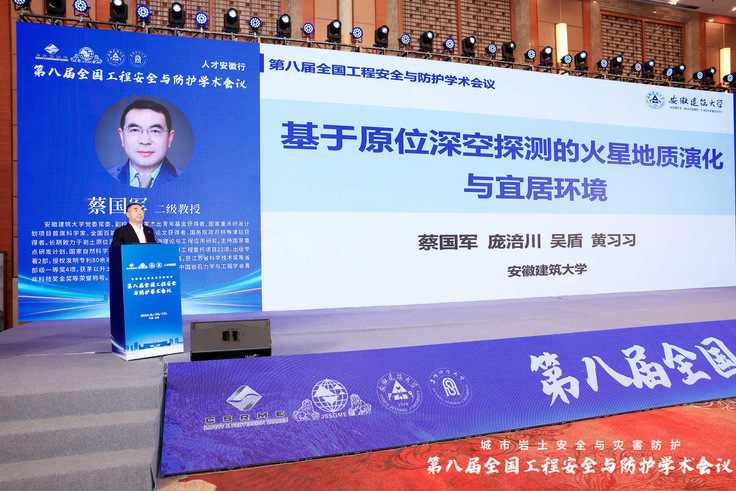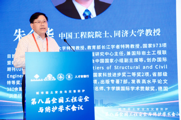 大会特邀报告环节由同济大学朱合华院士、北京建筑大学戚承志教授、南京大学施斌教授、南京理工大学何勇教授、中国科学技术大学纪杰教授、阜阳师范大学方廷勇教授、河海大学朱珍德教授和武汉大学罗忆研究员分别做题为目:“智慧基础设施数字底座建设及其实践”、“颗粒介质受载力链演化的力学模型”、“岩土体灾变感知与应用”、“新型爆炸毁伤与韧性防护技术”、“隧道火灾烟气流动特性及控制方法”、“城乡建设安全发展“安徽模式””、“极端环境下干热岩体渗流网生成智能演化理论研究”与“复杂应力路径下双江口花岗岩破坏特征及能量演化机制”的大会报告。