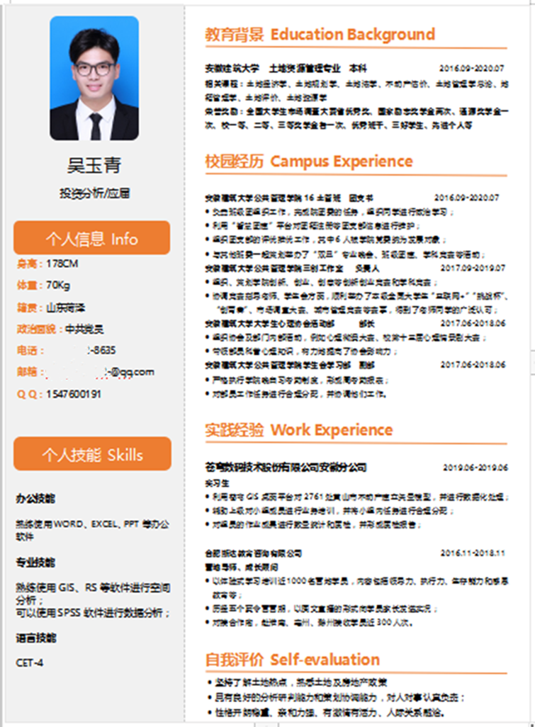 4月份比赛方案公布后,受到毕业班学生的高度关注,大家纷纷利用这次机会修改简历,在老师的指导下交出高品质作品。通过为期两个月的准备和筛选,层层选拔,师生共评,最终有12位同学的简历脱颖而出,土管专业吴玉青同学和社保专业孟淼同学的作品荣获一等奖,周书悦、夏宇、胡晶晶等同学获二、三等奖。