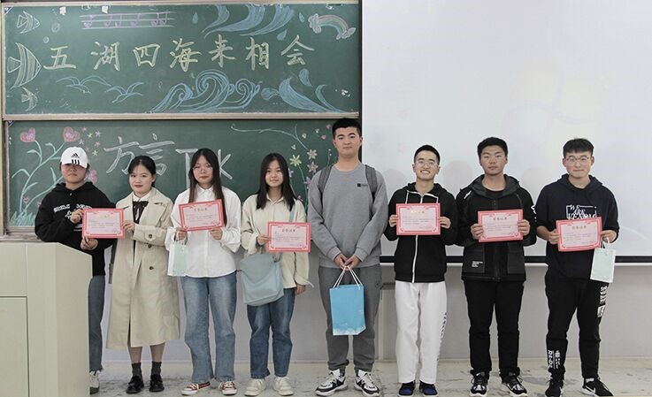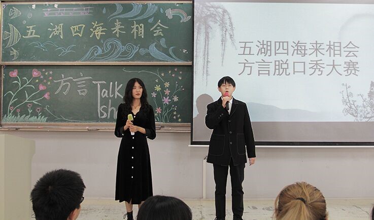 学生们用PPT展示了家乡的美食、美景和地方风俗,用独特的家乡方言进行了精彩介绍。无论是安徽宁国美丽的枫林,还是阜阳八河里旖旎的风景,各具特色引人向往。为了缓解比赛的紧张氛围,中场休息期间还组织了“猜歌名”和“你画我猜”等趣味小游戏,现场欢笑连连,气氛热烈。经过精彩的角逐和较量,本次方言大赛由刘馨雨、许啸雷同学摘得桂冠,苏玮佳、赵静研组合获得第二名,孙梦馨同学获得第三名,最后本次比赛在各位评委为获奖选手颁奖并合影留念下落下帷幕。