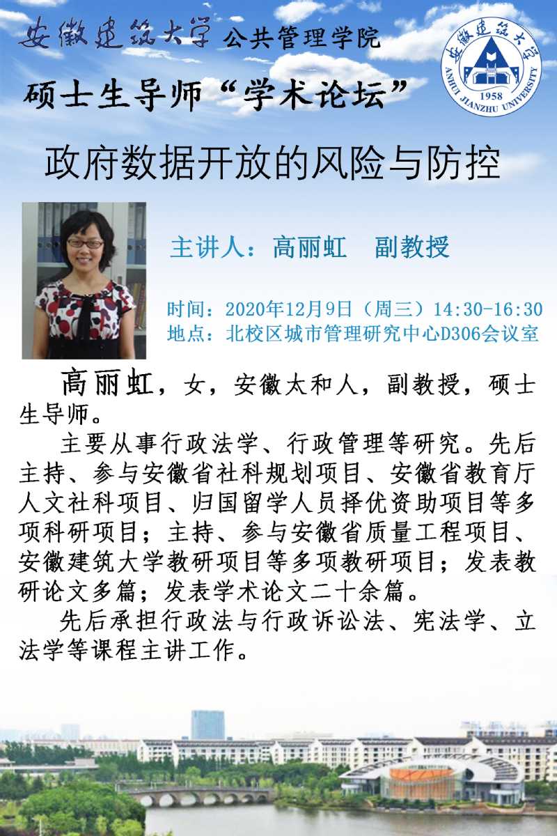 本网讯 12月9日下午,公共管理学院“硕士生导师学术讲座”第五讲在北校区安徽省城市管理研究中心会议室举办,高丽虹副教授担任主讲嘉宾,主题为《政府数据开放的风险与防控》,全体硕士研究生聆听了整场讲座。