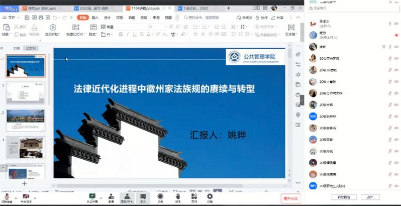 法学专业姚晔博士国家社科基金申报《法律近代化进程中州家法族规的赓续与转型》为题,从项目的选题依据、研究对象、研究现状研究价值等方面进行了阐述,并以“徽州家法族规”为切入点,剖视了传统文化法治思想在法律近代化进程中的变迁及对完善中国特色社会主义法律体系的重要现实意义。