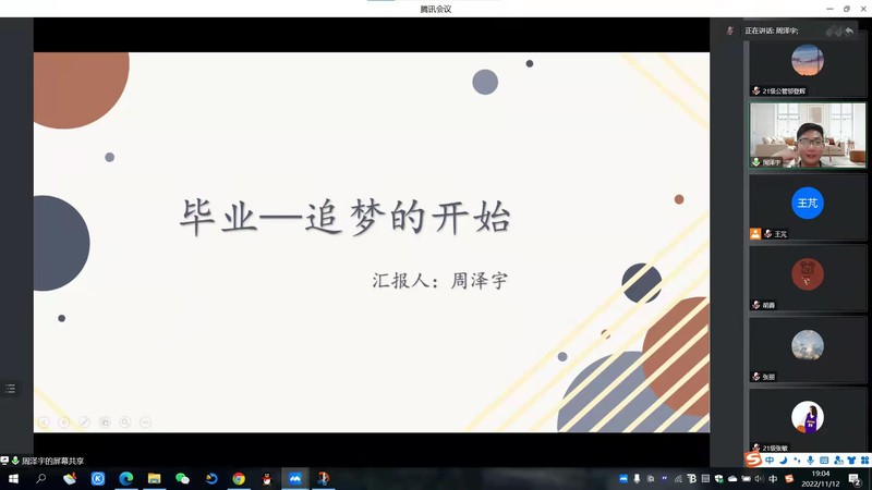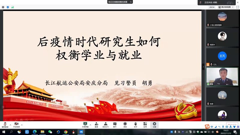 本网讯  为进一步教育引导研究生毕业生坚定理想信念,厚植爱党爱国、爱校荣校情怀,着力抓好学生毕业季关键节点,扎实做好毕业阶段的思想引领、就业促进工作,11月12日,公管学院线上举办了公共管理青年论坛第2期。论坛邀请了公共管理学院2022届优秀毕业生周泽宇、胡勇进行科研求职经验分享。论坛由研究生辅导员王芃主持,全体研究生参加。