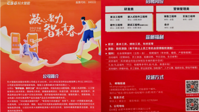 公管学院就业实习基地签约单位、教学合作单位科大智能科技股份有限公司受邀宣讲,工作人员通过PPT展示以及宣传视频向参会同学介绍了公司发展历程、业务板块、岗位设置、薪资福利等,在互动中对学生进行了就业指导、职业发展规划服务。此次用人单位提供人力资源管培生、实施工程师、营销管培生岗位,毕业生现场投递简历,积极与招聘人员沟通、邀约面试,现场气氛活跃。