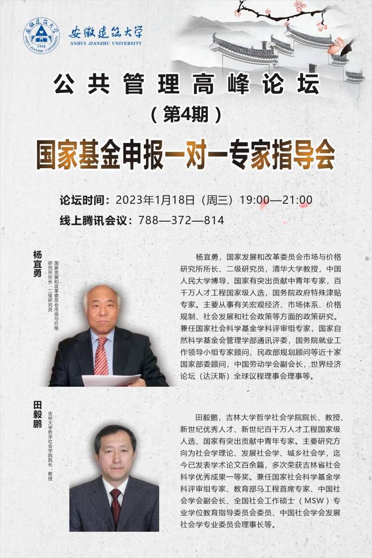 本网讯   进一步做好国家基金申报工作,提高学院国家基金申报质量,增强师生学术创新力与自信心,公管学院于1月18线上举办了公共管理高峰论坛第4期。论坛邀请了国家发改委市场与价格研究所所长、清华大学教授、中国人民大学博导杨宜勇研究员和吉林大学哲学社会学院院长、新世纪优秀人才、国家有突出贡献中青年专家田毅鹏教授开展了“国家基金申报一对一专家指导会”学术讲座。学院教师、研究生及兄弟院校师生共100余人参会,论坛由副院长王秉义主持。
