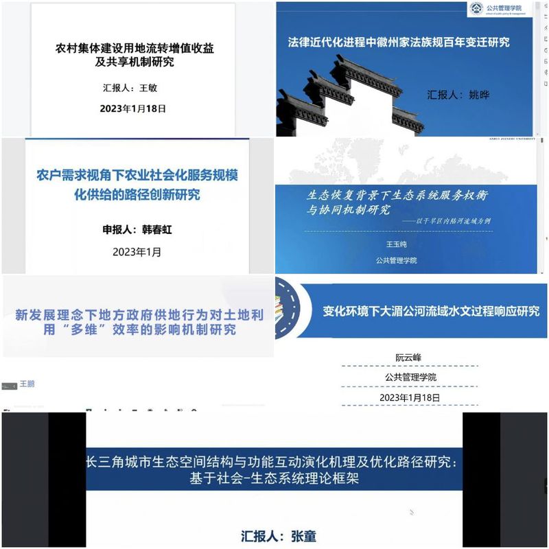 论坛采取五定国家青年基金申报人汇报、教授评议的方式进行。王敏从资源配置、治理结构、制度环境三个方面,汇报《农村集体建设用地流转增值收益及共享机制研究》;姚晔利用法学和历史学交叉学科优势,汇报了《法律近代化进程中徽州家法族规百年变迁研究》;韩春红从供需视角,汇报了《农户需求视角下农业社会化服务规模化供给的路径创新研究》;王玉纯利用多模型耦合和情景分析方法,汇报了《生态恢复背景下生态系统服务权衡与协同机制研究——以干旱区内陆河流域为例》;王鹏制度环境、行为特征、多维效率的视角,汇报了《新发展理念下地方政府供地行为对土地利用“多维”效率的影响机制研究》;阮云峰水文气象、水资源响应水电开发评估为核心,汇报了《变化环境下大湄公河流域水文过程响应研究》;张童从社会与生态交叉视角,汇报了《长三角城市生态空间结构与功能互动演化机理及优化路径研究:基于社会—生态系统理论框架》。