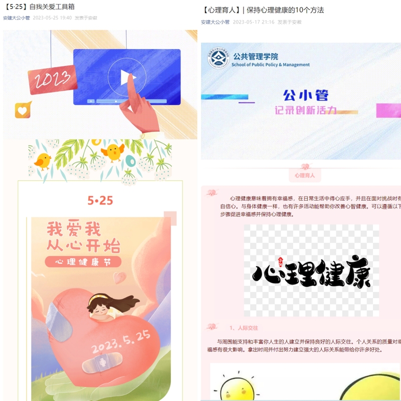 为推动学院心理育人工作取得实效,通过“安建大公小管”新媒体平台,聚焦学生成长生活中的热点问题,定期推送心理健康、自我调适、自我发展等知识,做到“线上”和“线下”统一,不断形成宣传合力,切实增强吸引力和感染力,宣传心理健康知识、倡导健康生活方式、促进学生健康成长和全面发展,筑牢学生成长成才心理健康防护网。