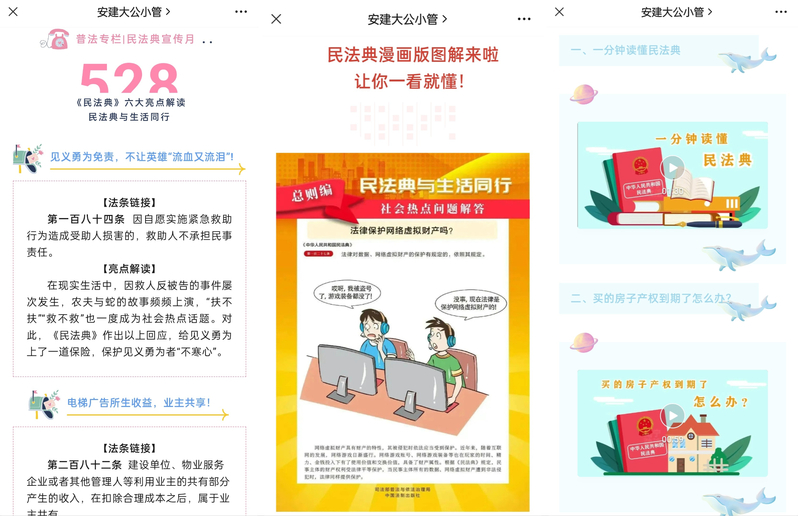线上线下齐宣传。普法润心,“典”亮校园。公管学院通过安建大公小管公众号的普法专栏开设《民法典宣传月》的主题专栏进行线上宣传,分别从经典案例、漫画图解、亮点解读、普法教育等不同角度发送推文对民法典知识进行解读,以漫画、微电影以及文字分享等多样的形式吸引同学们点击阅读。线上主题推文进一步拓宽了传播渠道,丰富了普法方式,加深学生们对民法典意义与内涵的理解。
