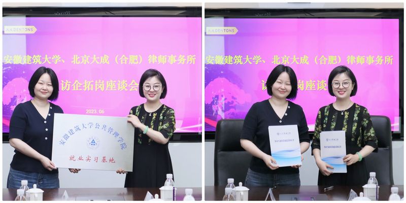 北京大成(合肥)律师事务所主任纪敏对安建大公管学院一行的到来表示热烈欢迎,详细介绍了律所组织架构、业务发展、社会服务、员工培养等情况,表示可以在律师青训营、辩论赛、实习实践方面深化合作。公管学院优秀校友欧开畅介绍了律所入职培养模式、律所文化,欢迎优秀学弟学妹关注大成、加入大成。