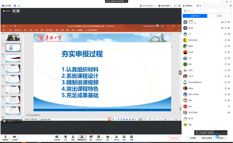 杨洪涛教授首先对国家一流课程申报准备工作进行辅导,提出要认真组织材料、系统设计课程、精制说课视频、突出课程特色、充足成果基础,并强调要转换角色,从专家视角审视申报材料,并详细解读了一流课程评审的标准要求。此后,土管系钱丽副教授、人社系陈松林教授、赵斌斌博士代表课程申报团队,依次汇报当前课程申报工作进度、申报书及附件材料准备情况以及申报工作中存在的难点、疑点、痛点。杨洪涛教授采用“一对一”方式,对个课程团队的申报书进行了点评,从赛道选择、团队搭建、历程呈现、内容重构、教学组织、效果评价、亮点提炼、优势熔炼、特色体现等优化完善,以及说课视频、课程实录等技巧和注意事项上,提出针对性指导意见,特别强调要材料“实打实”,相关课程教学团队成员及相关参与教师均表示受益匪浅。