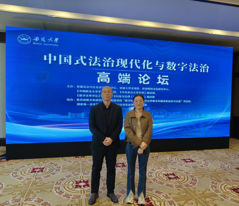 本网讯 10月23日,中国式法治现代化与数字法治”高端论坛在合肥举办。本届论坛由安徽法治与社会安全研究中心、安徽大学法学院、安徽网络法治研究中心、《中国政法大学学报》编辑部、《华东政法大学学报》编辑部、《数字法学评论》编辑部、《科技与法律(中英文)》编辑部联合主办,主题“中国式法治现代化与数字法治”。论坛近百政府领导、专家学者、法律实务界人士莅临现场参会。公管学院院长黄佳豪、法学系教师黄大芬应邀参会。