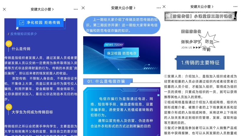 学院组织建立反传销、反电诈宣传志愿者队伍,走进学生宿舍、新生自习室、招聘会现场,邀请同学们观看警示视频、阅读警示案例,广泛开展志愿宣传服务活动。学院各班级在辅导员的组织下进行了“反传销 我先行”承诺签名活动,学生郑重签下了自己的名字,并表示要坚决抵制传销,远离传销,坚决不参加任何形式的传销活动。