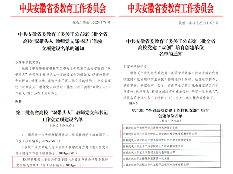 本网讯近日,中共安徽省委教育工委发布《关于公布第二批全省高校“双带头人”教师党支部书记工作室立项建设名单的通知》,遴选建设全省高校30个 “双带头人”教师党支部书记工作室,公共管理学院人力资源与社会保障系教师党支部连瑞瑞工作室获批立项建设。