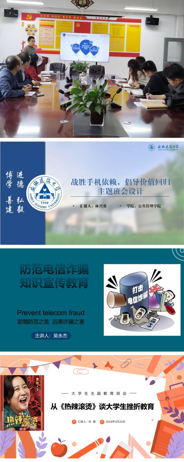 辅导员围绕“预防电信诈骗”“大学生挫折教育”“大学生手机依赖”“二十大精神学习”“网络安全”等主题,精心设计班会内容,用心组织班会过程,巧妙采用PPT、视频、互动问答、小组讨论、学习通等形式,综合展示班会教育思路、方法和效果,呈现了一堂堂寓意深刻、精彩纷呈的主题班会。在经过激烈的比拼后,评委综合考虑多方面进行评分,择优推荐辅导员参加校级决赛。活动最后,各评委对辅导员的精神风貌和扎实的理论功底与职业素养给予了充分肯定,并分别对辅导员在班会设计中的不足之处提出了合理建议。同时希望全体辅导员继续抓业务促能力、比学习促交流、强素质促工作,不断提高自身的理论素养、业务水平和综合能力。