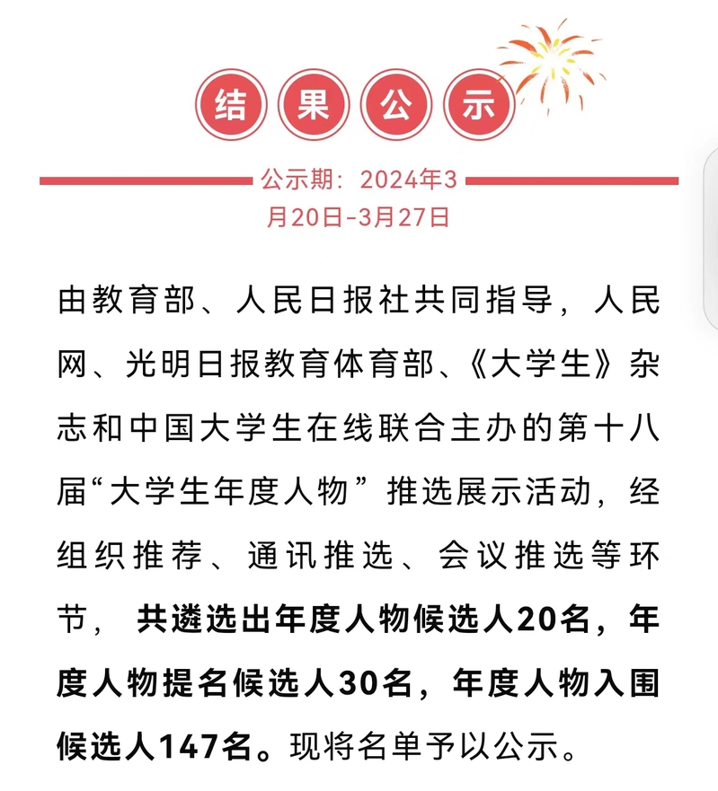 本网讯 近日,由教育部、人民日报社共同指导,人民网、光明日报教育体育部、《大学生》杂志和中国大学生在线联合主办的第十八届“大学生年度人物”推选名单公布,我校公共管理学院2020级人力资源管理专业本科生俞乐凡荣获全国第十八届“大学生年度人物”提名奖。