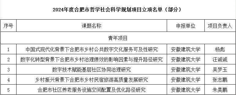 本网讯  近日,合肥市哲学社会科学规划办公室公布了2024年度合肥市哲学社会科学规划项目立项名单,公管学院研究生获立5项青年社科规划项目,约占全省立项总数的10.4%,立项总数位列全省第二。