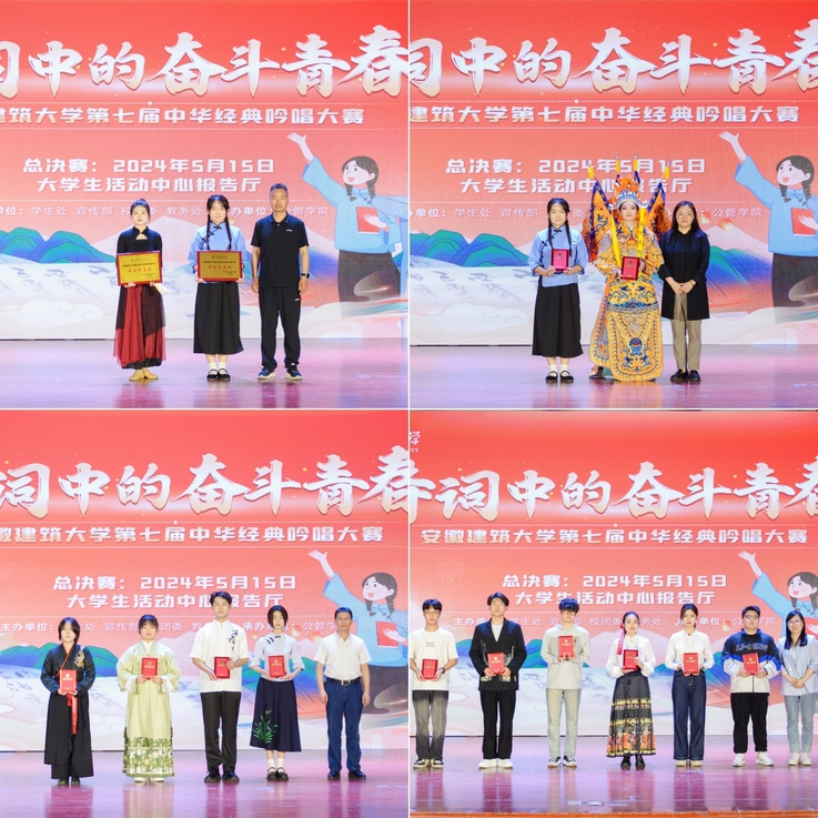 经评委们的认真评审,经管学院《秋风秋雨愁煞人》公管学院《梨园行》荣获一等奖;环能学院《请党放心 强国有我》、艺术学院《古韵今生 责任之大》、机电学院《满江红》、数理学院《满怀冰雪英雄无觅 百川浩荡剑刻青春荣获二等奖;材化学院《少年中国说》、经管学院寻找红色记忆 赓续瑰丽篇章》、外国语学院《焕然文采照青春 一策奋斗自在身》、电信学院《月光下的中国》、建规学院《不坠吾辈青云志》、土木学院《诗仙李白:一生风华尽墨香》荣获三等奖;外国语学院《焕然文采照青春 一策奋斗自在身》荣获最佳创意奖,经管学院《秋风秋雨愁煞人》荣获最佳表演奖。