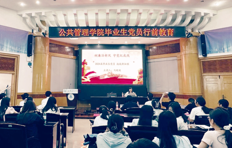 本网讯 为进一步强化毕业生党员理想信念教育和廉洁教育,提升党性修养,永葆党员本色,在新的岗位上继续发扬“进德、弘毅、博学、善建”的校训和党员先锋模范作用,6月18日下午,公管学院在建树楼三楼报告厅举办2024届毕业生党员行前教育活动。学院党委副书记(主持工作)马晓艳、副书记江侠、各学生党支部书记、兼职组织员及2024届全体毕业生党员参会,活动由学院党委副书记江侠主持。