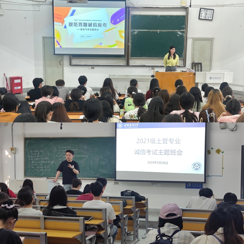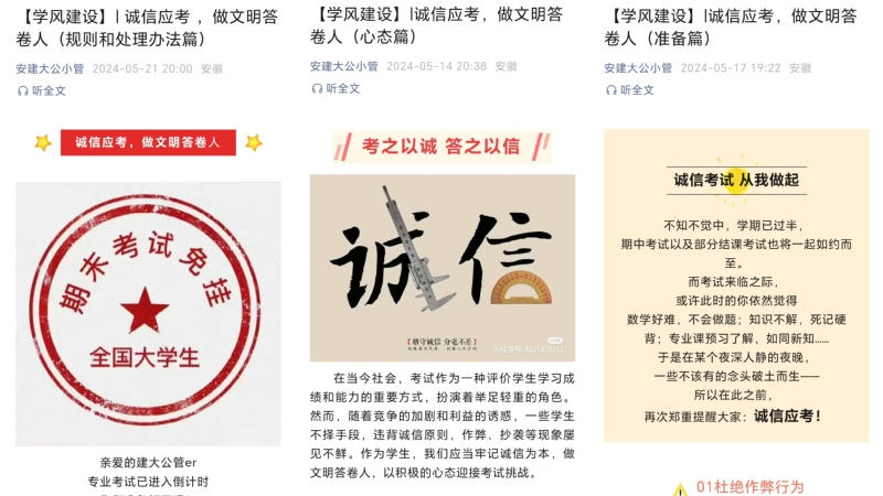 学院结合学风建设、班级建设、骨干建设等,面向高年级强化动员和引领,面向低年级强化组织和教育,将“教”与“学”、“真”与“实”紧密结合起来,开展了一系列形式多样的诚信教育活动。“安建大公小管”微信公众号发布“诚信应考,做文明答卷人主题推文;全体学生在主题班会上认真阅读并签署诚信考试承诺书,承诺自觉抵制违规行为;学院开展诚信教育宣传条幅签名活动,组织学生党员举行诚信教育宣讲活动,多方位建设诚信教育。