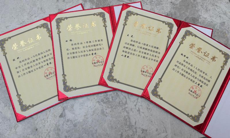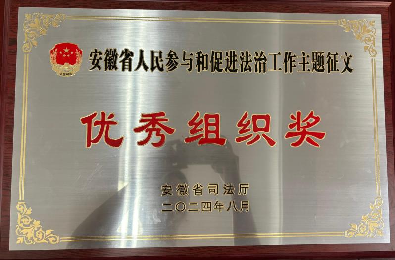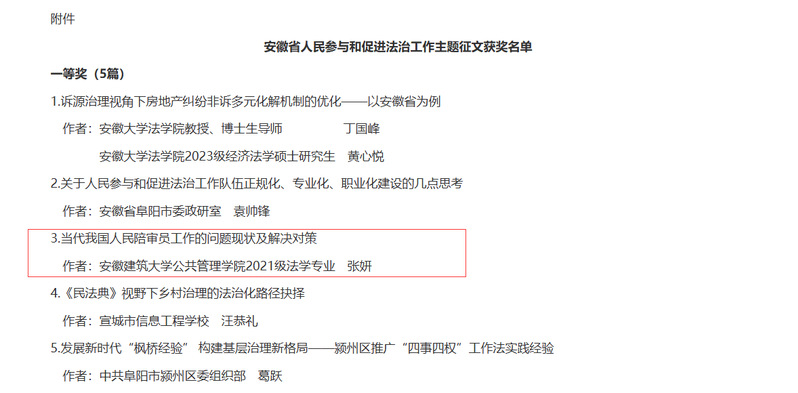 本网讯 近日,第一届安徽省人民参与和促进法治工作主题征文活动评审结果揭晓:公管学院荣获安徽省司法厅颁发“优秀组织奖”,2021级法学专业学生张妍荣获征文比赛一等奖;田伟、王昊获二等奖;赵玥琪获三等奖。