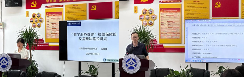杨祖卿以《“数字弱势群体”权益保障的反垄断法路径研究》为主题,从风险透视、理论基础、价值选择三个方面剖析了数字时代背景下弱势群体的权益现状与挑战。指出,反垄断法作为维护市场竞争秩序、促进公平正义的重要法律工具,在保障数字弱势群体权益方面大有可为。周翼虎以《安徽省农村人口流动格局演变与人地关系重构研究》为主题,安徽省农村人口的流动行为在时间和空间上的特征和发展历程、对安徽省农村土地利用造成的影响、如何通过差别化的政策设计对农村人地关系进行重新构建这三个部分渐进式进行阐述分享。