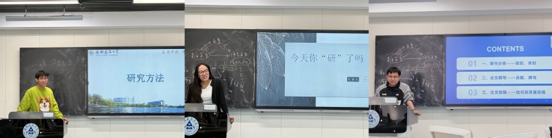 徐运发结合自身科研经验,由浅入深介绍了论文写作过程中常用的理论模型以及定量研究的主要撰写流程,同学们受益匪浅。赵涛涛分享了期刊分类常识、论文撰写和投稿的技巧,并寄语了同学们坚定目标,脚踏实地,做好科研工作。冯玲霞从“学、研、写、玩”四个方面向同学们提倡在学习相关专业知识、提升学术素养的同时,可以通过运动、音乐等方式缓解压力,增强身体素质。辅导员周翼虎最后做出总结,强调要在研究生阶段提升自身竞争力,做好职业生涯规划,勇于询问,敢于交流,珍惜科研学习时光。