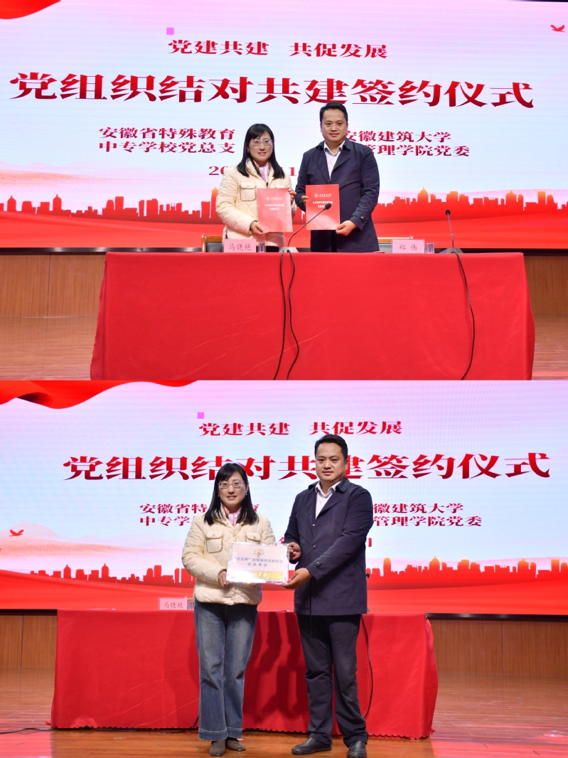 随后,郑伟介绍了残疾人职业教育及省特教中专学校党建、发展等工作情况。公管学院党委副书记(主持工作)马晓艳介绍了公管学院基本情况、基层党建的经验和成果,并围绕双方共建党建品牌探索多元合作形式,通过党建合作搭建发展桥梁,拓宽思路、共同发展。双方就学院党委加入省特教中专学校“常青树”扶残助残党建联盟进行了详细商谈,并就深化落实党建共建、党建带团建、活动开展、业务支持等工作达成了一致意见。郑伟与马晓艳签订党建共建协议,并举行了加入“常青树”扶残助残党建联盟入盟授牌仪式。