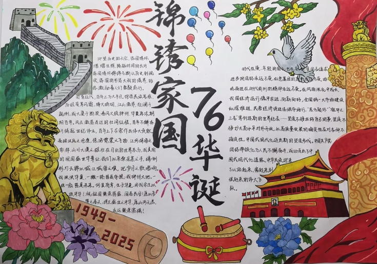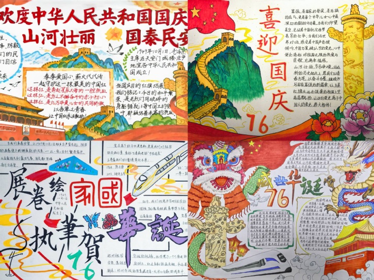 比赛中,同学们创意迭出、佳作频现。马苗苗同学的作品《锦绣家国,76华诞》,以细腻的笔触、鲜明的色彩勾勒出祖国76年来的发展巨变,凭借其深刻的主题内涵与精湛的制作工艺荣获一等奖,成为大赛中的一大亮点。洪卓博的《欢度国庆》、张晰月的《山河万里盛世华诞》、翁锦晏的《喜迎国庆,绘梦山河》以及武昱畅的《祝福祖国76华诞》、张梦楠的《庆贺祖国76华诞》等作品也表现出色,分别斩获二等奖、三等奖及优秀奖。这些作品或展现祖国的壮丽山河,或回顾国庆的喜庆氛围,或讴歌祖国的繁荣昌盛,从不同角度诠释了对祖国的深情告白。