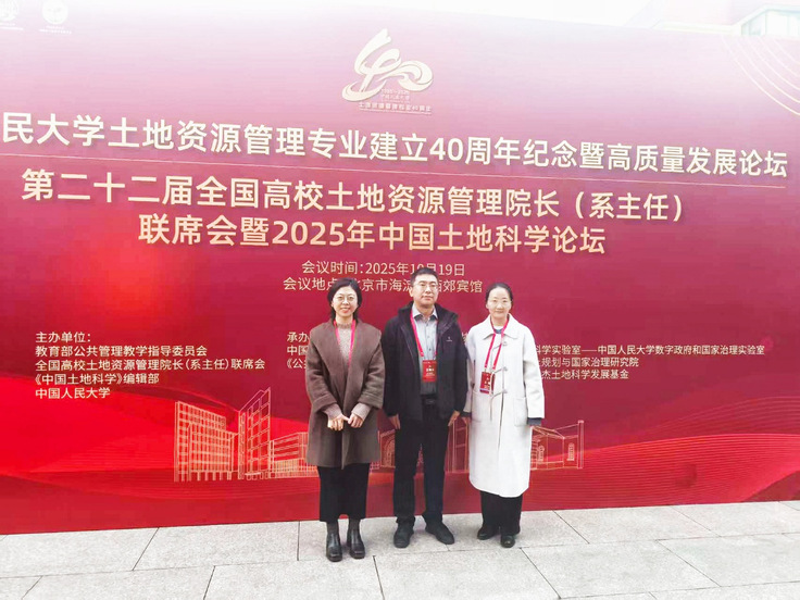 本网讯  10月19日,第二十二届全国高校土地资源管理院长(系主任)联席会暨2025年中国土地科学论坛在北京顺利召开。会议由教育部高等学校公共管理类专业教学指导委员会、全国高校土地资源管理院长(系主任)联席会、《中国土地科学》编辑部和中国人民大学联合主办,来自中国人民大学、浙江大学、中国农业大学等近140家单位的600余名专家学者出席会议。学院副院长王秉义、土管系副主任王玉纯、青年教师王鹏受邀参会。