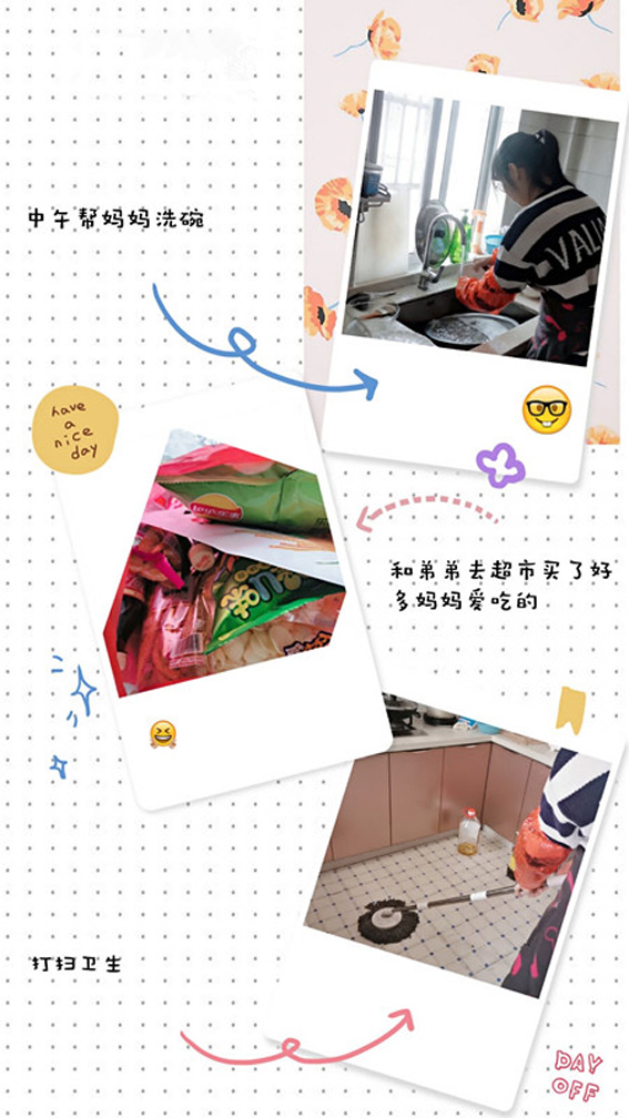 “记录”——同学们用实际行动表达心中对妈妈的爱意并通过照片形式记录下来,形式丰富多样,有帮妈妈分担家务的、有给妈妈送花的、有省下零花钱为妈妈买礼物的······同学们的爱没有规定的形式,没有华丽的包装,但却足够让母亲感动与欣慰。