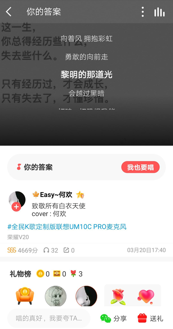 在活动中,参赛者们用全民K歌APP为爱而唱,致敬英雄,共候春天如约而至。其中来自孟昊炎、罗智全、汪明枫同学的原创歌曲以自己的hip-hop风格告诉了我们“黑夜,终究被逾越”,“春天,奏希望颂歌”,希望疫情早日结束,国泰民安。19工管朱嘉豪演唱的《你的答案》唱出一种特别的力量,“勇敢的向前走,黎明的那道光会越过黑暗,打破一切恐惧,我能找到答案”。
