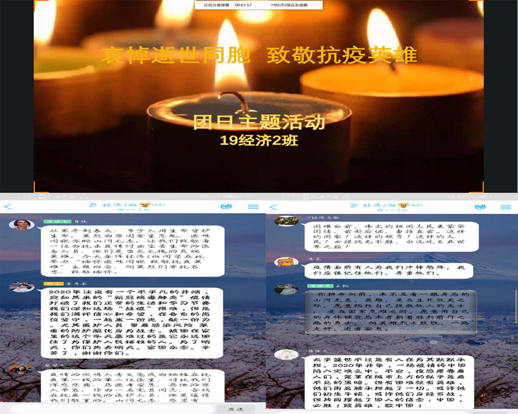 “缅怀逝世同胞,致敬抗疫英雄”是2019级经济学2班的线上班会主题,班会开始时,团支书肖悦向同学们回顾了疫情开始之时,一名又一名医护人员勇敢逆行,一位又一位人民警察坚守岗位,向全国人民展现出中华民族无畏团结的精神。同学们在班级群中以文字的方式表达了自己对本次疫情的深刻感悟,认识了在疫情当中无畏逆行者和牺牲烈士身上所体现出来的高贵品质,从而为他们在以后的学习生活中树立更加崇高的理想信念奠基了基础,也更加提升了他们对打赢疫情攻坚战的信心与勇气。