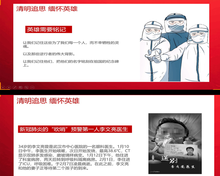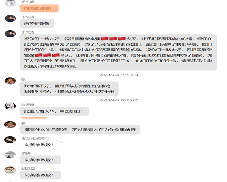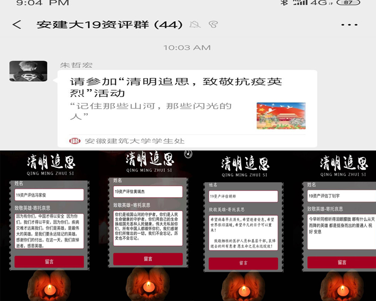 不同的班会主题,相同的感怀哀思。2019级资产评估班长朱哲宏于10时带领同学们共同默哀三分钟。此时此刻全国汽车、火车、舰船鸣笛,防空警报鸣响,深切悼念新冠肺炎疫情牺牲烈士和逝世同胞。默哀结束,同学们参加了“清明追思,致敬抗疫英烈”活动,同学们观看后积极在推文后留言,山河无恙国泰民安的声音在每个同学的心中回响,疫情发生,战斗在一线救死扶伤,迎难而上的医护工作者就是这个时代最伟大的英雄。