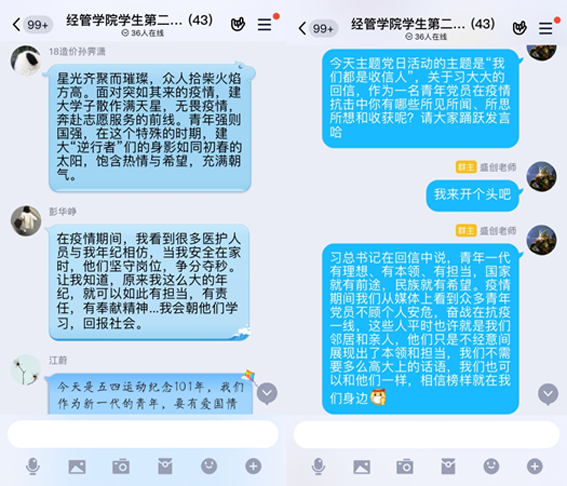 本网讯  为纪念五四爱国运动101周年,学习习近平总书记给北京大学援鄂医疗队全体“90后”党员的回信,5月4日,经济与管理学院学生第二党支部响应学校号召,在支部的qq群开展了一场别开生面的“云端”主题党日活动。