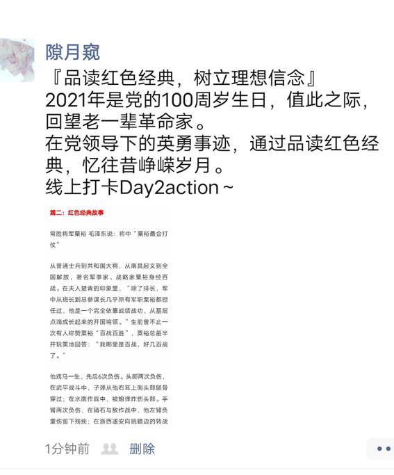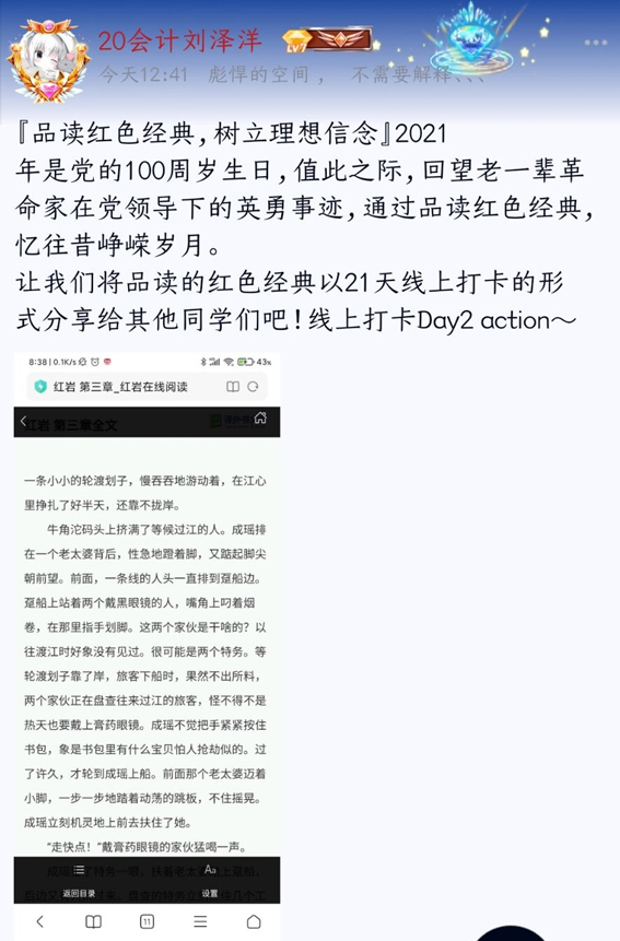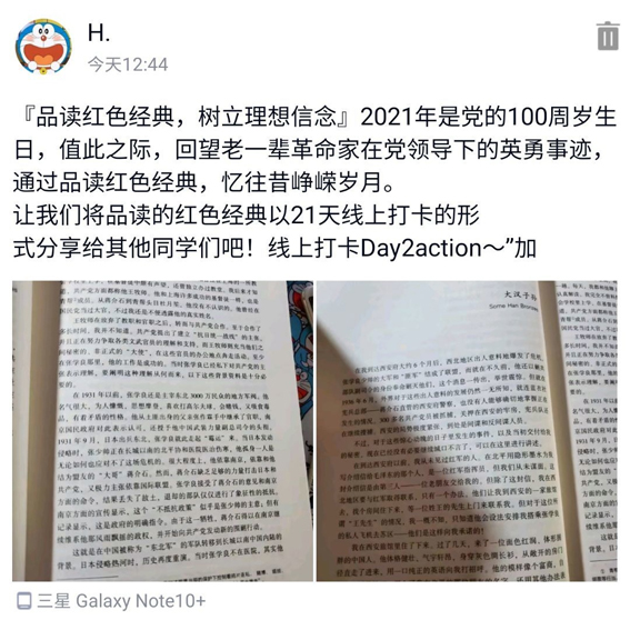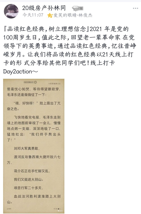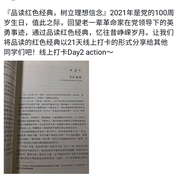 在“21天阅读习惯养成计划”活动中,同学们选择一本自己感兴趣的经典红色读物,每天阅读并记录相应的内容,上传至微信朋友圈或者QQ空间进行打卡。经典红色读物内涵丰富,线上打卡操作灵活便捷,极大的激发了同学们的阅读热情,反响热烈。