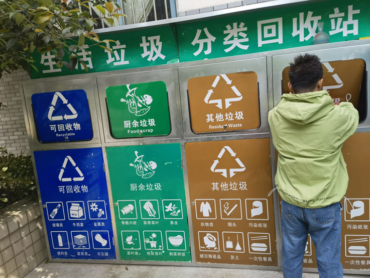 随后同学们立即行动起来,认真做好寝室垃圾分类和回收工作。参与活动的同学分成两组,一组将寝室垃圾进行分类打包扔进相应的垃圾桶,另一组则站在宿舍楼门口对前来扔垃圾的同学进行科普指导,协助做好垃圾分类。