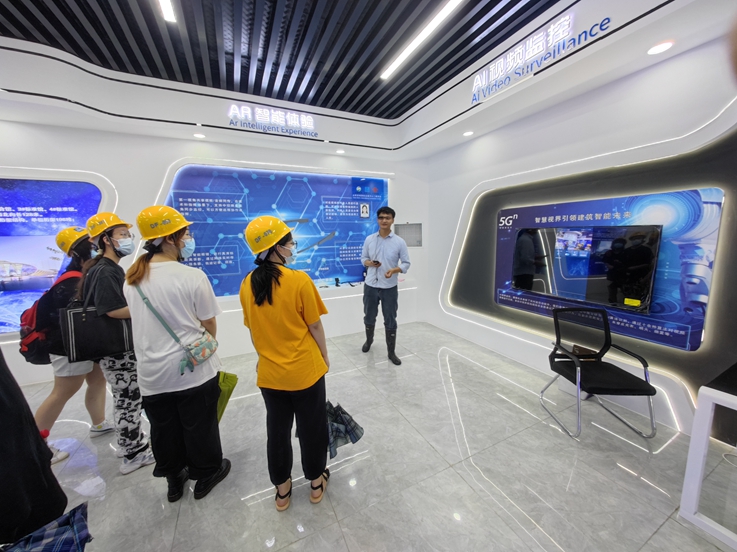 在工程师刘李宁与王家瑞的陪同下,师生先后参观了项目部的5G施工体验馆和会展中心二期展馆,了解5G技术在员工考勤、疫情体温检测和施工安全方面的应用以及幕墙施工和装配工艺及流程。通过参观,同学们深刻认识到在人工智能和大数据背景下建筑行业管理模式和施工工艺流程正发生着巨大变革,拓展了同学们的视野。
