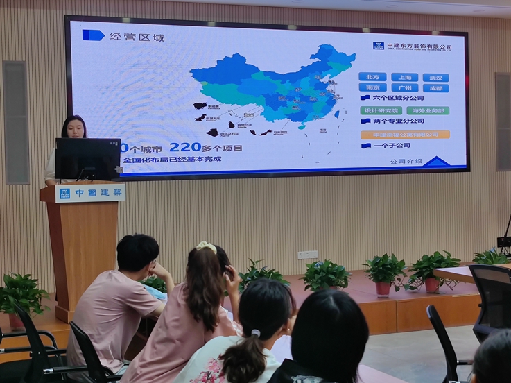 总经理助理孙鹏代表公司对学院师生来项目部开展认识实习表示热烈欢迎,并系统介绍了中建东方装饰公司的发展历程、企业文化、发展平台和行业发展前景。人事部负责人黄炫熳详细展示了东方装饰公司近年来承建的重点建设工程项目情况。通过聆听企业专家报告,加深了同学们对资产评估专业知识行业应用前景的认识,明晰了未来的学习方向和就业前景。
