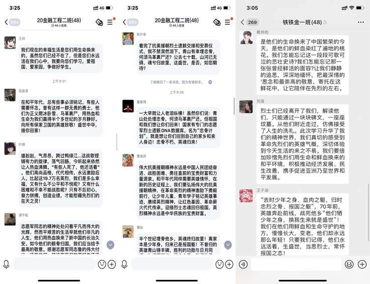 直播结束后,同学们纷纷在QQ群里发表自己的感想,19级经济学1班马云龙说:“通过今天的活动,让我想到了习近平总书记之前说的话,‘一个有希望的民族,不能没有英雄;一个有前途的国家,不能没有先锋。’志愿军是我们未来成长的灯塔,指引着我们不断向前的道路和方向。”20级资产评估王硕同学说:“英勇的志愿军们为了捍卫和平、守家卫国,远离亲人故土,奔赴战争前线,牺牲在异国他乡,他们是最可爱的人,是我们的民族英雄。”