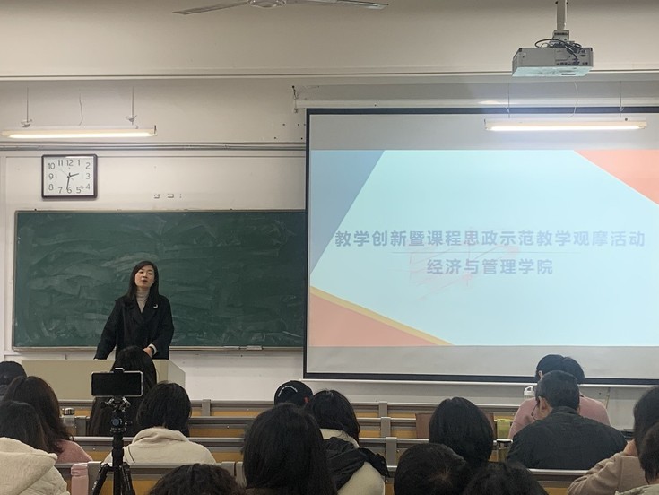 本网讯  12月15日,为深入推进学院课堂教学改革与创新,发挥课程思政协同育人功能,全面提升教师教学能力,经管学院举办课堂教学创新暨课程思政示范教学观摩活动。本次活动由2020年教学创新大赛校赛一等奖获得者王素凤教授和2021年校第九届青年教师课堂教学比赛一等奖获得者章蓓蓓博士担任主讲。学院副书记帅英主持示范观摩教学活动,学院全体教师参加。