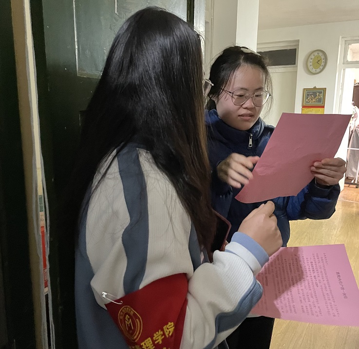 本网讯 近期国内疫情防控形势严峻,为确保师生生命安全和身体健康,巩固来之不易的防疫成果,3月18日晚,经管学院学生志愿者走家入户进行疫情防控宣传活动。