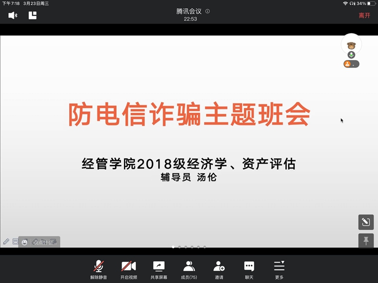 通过播放反诈安全教育视频、通报各类诈骗案例,特别是一些借助疫情进行诈骗的新情况,总结犯罪分子的诈骗套路和手法,帮助同学们提高反诈骗意识,提醒同学们不要贪图便宜,不刷单、不转帐......,用好反诈骗APP,营造“人人反诈、人人防诈”的良好氛围。