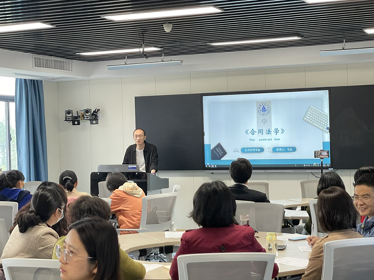 马志首先从学情分析、教学目标、课程思政融入和教学方法四个方面进行了5分钟的说课,分享了其在以学生为中心的教学理念下,如何积极运用新技术、新媒体等现代信息技术,巧妙融入政治认同、家国情怀、美好品德和职业道德等思政元素的经验做法。他还以《合同法学》中的“合同履行原则”这一知识点讲解为例,通过案例导入、课堂研讨、启发式教学,为大家进行了10分钟的现场教学展示。