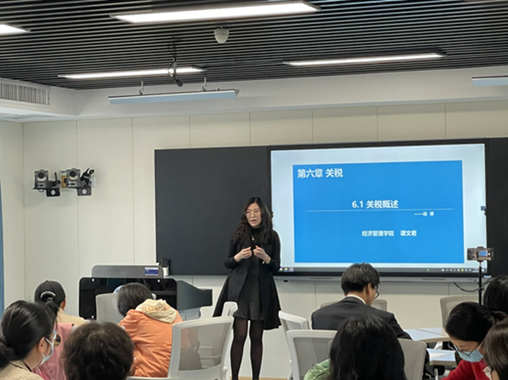 谭文君围绕学情分析、课程思政融入、教学设计和教学过程四个方面进行了5分钟的说课,并以《国际贸易》中“关税概述”这一知识点讲解为例,现场进行了15分钟展示,通过展示分享了如何挖掘时政和社会热点新闻作为教学案例,提炼思政元素,巧妙融入课程内容的经验做法。