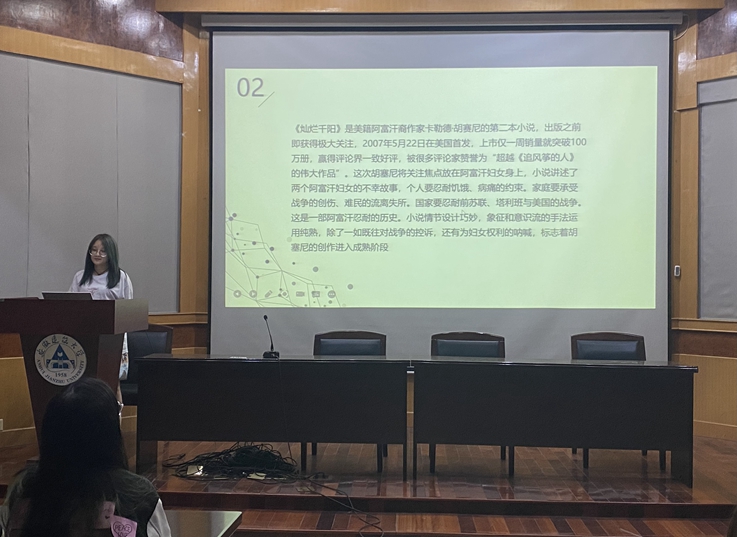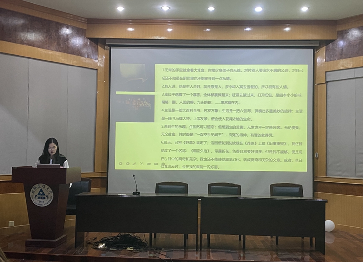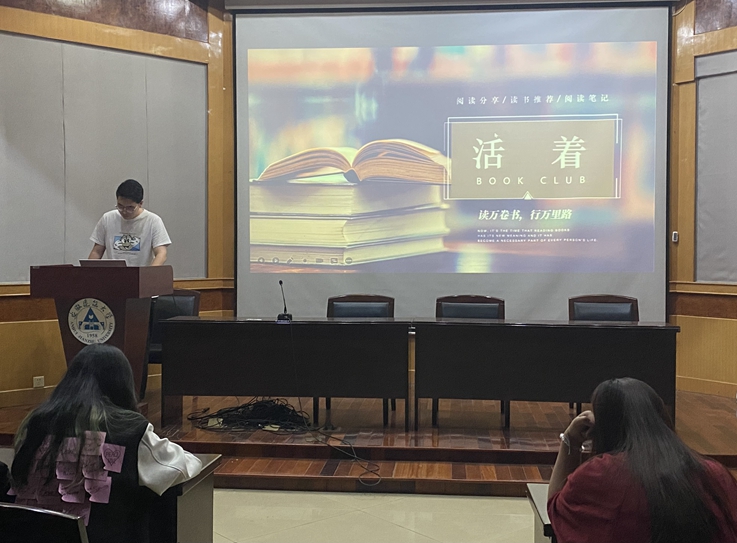 活动中,每一位参与的同学都以PPT与演讲相结合的方式向大家分享自己最喜爱的书籍,同学们交流读书心得,畅谈读书感言,思维的碰撞让这场读书分享会精彩不断,现场气氛轻松愉悦。《朝花夕拾》、《水浒传》、《灿烂千阳》、《边城》……同学们的分享饱含深情、引人入胜,而其中最令人印象深刻的,是21财管2班付嘉成分享的余华名作——《活着》。故事讲述了主人公徐福贵坎坷的一生,其中蕴含着生与死的思考,令人动容。这本书让我们看到了一种活着的乐观精神,几则趣味横生的小故事让同学们对作者余华豁达的生活态度和独特的观察视角有了更为深刻的了解,同时也产生了极大的阅读兴趣。书中自有黄金屋,书中自有颜如玉。同学们推荐的书籍种类各有不同,古今中外、风格各异,在大家分享的过程中,倾听者发散思维,与讲述者共同思考,也锻炼了思维能力,积累了阅读知识。