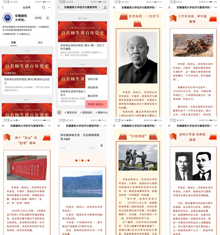 二是突出品牌辐射效应。从“观、听、读、行、讲”等五维度,高标准高质量开展特色活动,做到支部建设有特色,品牌辐射有效度。开展全体教师党员观看“庆祝中国共产党成立100周年大会”直播活动、“时代楷模”邱军校友先进事迹报告会进学院活动、“读百年党史、绽芳华人生”读书分享主题党日活动、大学生暑期“三下乡”党史学习实践活动、“经管青年心向党,奋斗强国跟党走”系列团日活动。在学院微信公众号开辟“百名师生讲百年党史”活动专栏,通过“领导干部带头讲、支部党员跟进讲、青年学子自主讲”的模式,示范带动、点面结合,在全院师生中掀起人人爱学党史,人人争讲党史的热潮。