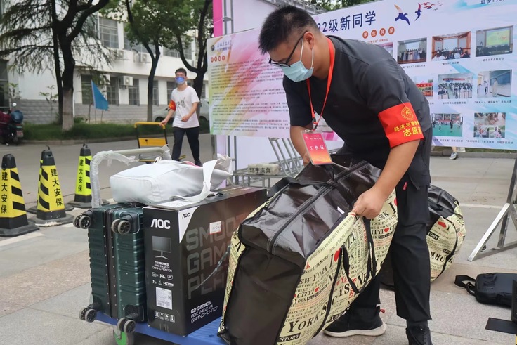 学校大门处,新生们依次出示健康码、行程码、核酸检测报告,在进行体温检测后,由志愿者带领到达报到点进行入学登记。